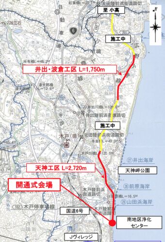 福島県土木部道路整備課発表資料より 福島県では、一般県道広野小高線(通称:浜街道)の「天神工区(延長2,720m)」及び「井出・波倉工区(一部区間)(延長1,750m)」が2020年3月8日(日)15時30分に開通します。