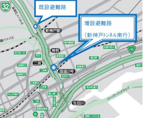 阪神高速発表資料より阪神高速では、新神戸トンネル(南行)のトンネルの電気設備室を改修してトンネル内から地上への避難路を増設しました。
