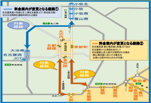 名古屋高速発表資料より名古屋高速、NEXCO中日本では、ETC車を対象に「経路によらない同一料金」の対象となるルートを走行した場合の料金案内が変わります。