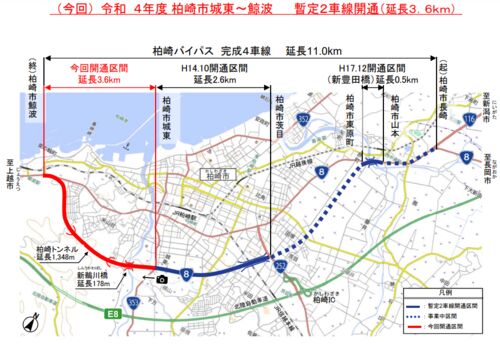 国土交通省 北陸地方整備局 長岡国道事務所発表資料より新潟県では、国道8号柏崎バイパスの一部区間、柏崎市城東~鯨波区間(延長3.6km)が開通します。