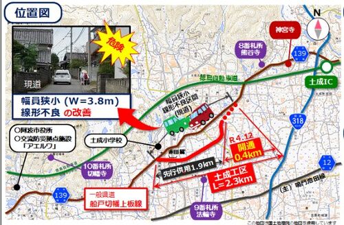 徳島県徳島市発表資料より徳島県徳島市では、一般県道 船戸切幡上板線「土成工区」の一部延長0.4kmが開通します。これにより先行して供用された延長1.9kmと合わせて全線2.3kmが開通したことになります。