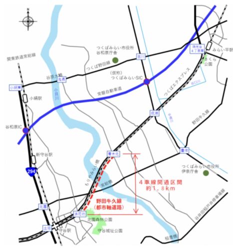 茨城県 土浦土木事務所発表資料より茨城県では、県道野田牛久線(都市軸道路)の一部区間が4車線化されました。