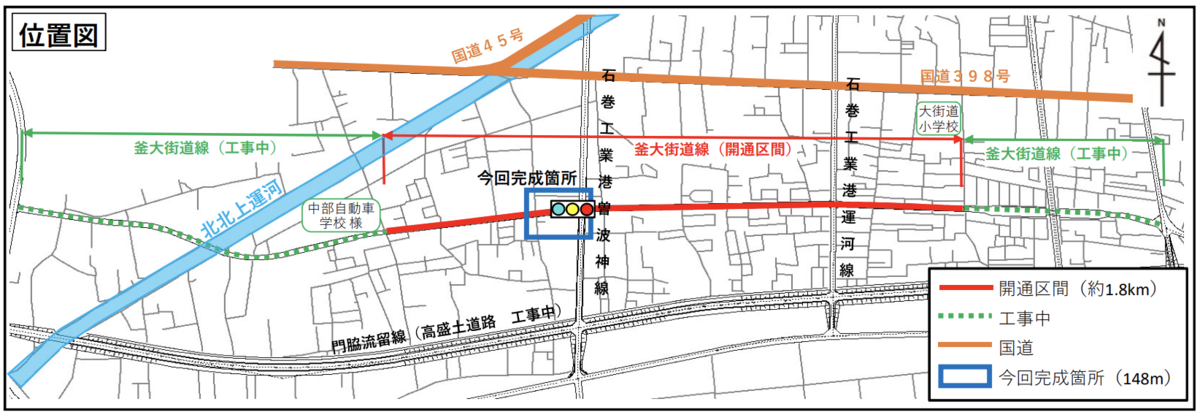 宮城県石巻市では、都市計画道路 釜大街道線と石巻工業港曽波神線との交差点工事が完了し、合わせて新たな区間延長148mが開通します。