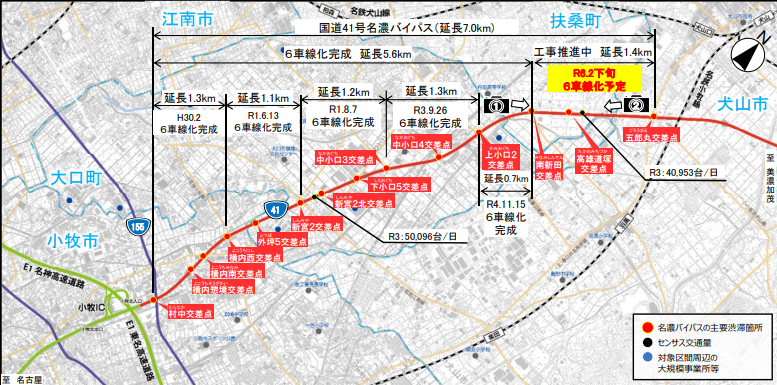 愛知県では、国道41号名濃バイパス延長7.0kmのうち村中交差点から南新田交差点間(延長5.6km)は6車線での整備が完了していますが、残りの南新田交差点から五郎丸交差点間までの区間も6車線への切り替えが完了するそうです。